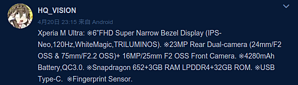 According to GSMArena, a new smartphone Sony Xperia M Ultra is based on a single platform Qualcomm Snapdragon 652 with eight cores and Adreno 510 graphics, which is complemented by 3 GB of RAM type LPDDR4. two cameras are provided: 23-megapixel main and a 16-megapixel front. Other technical specs include frameless IPS-display diagonal of 6 inches and a resolution of 1920 x 1080 pixels (format Full HD), the internal drive 32GB, USB port Type-C, a fingerprint sensor and the battery on 4280 mAh that supports fast function charge Quick charge 3.0.