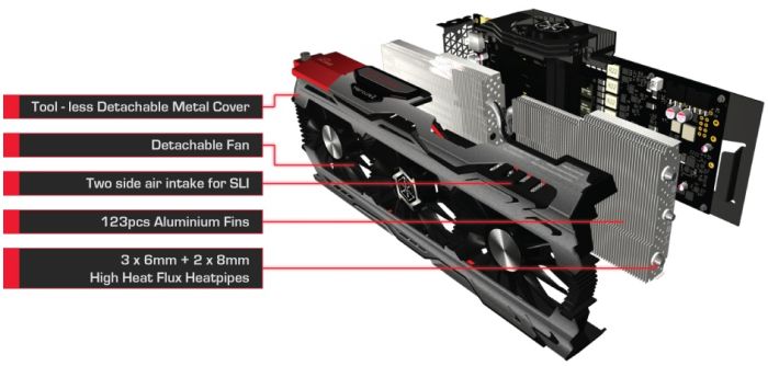 The cooling system includes a metal base of the heat sink 123 aluminum fins, three heat pipes with a diameter of 6 mm and two heat pipes with a diameter of 8 mm, as well as three fan size of 92 mm and compact one - on the side of the section. The metal casing of the cooling system can be removed without tools, fans also can be removed for cleaning from dust.