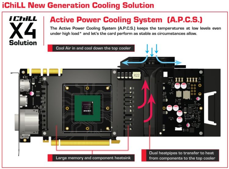 To be precise, we will speak about GeForce GTX 1080 iChill X4 modification that offers frequency 1733/1873/10400 MHz and cooling system with four fans, forcing invade the space of three expansion slots (two and a half, to be precise). video length is 302.2 mm, width - 115.2 mm. By the power supply is connected through a combination of graphics and Eight-six power connectors recommended power supply unit - 550 watts.