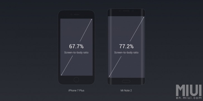Xiaomi Mi Note 2 is curved OLED-display, which occupies 77.2% frontal surface against 67.7% of the iPhone 7 Plus. Its resolution is 1920 x 1080 pixels (Full HD). The base of novelty lay quad-core Qualcomm Snapdragon 821 chip with a clock speed of 2.35 GHz, complete with 4 or 6 GB of RAM type LPDDR4. Also, the smartphone is equipped with a 22.56-megapixel rear camera with Sony IMX318 sensor system of electronic image stabilization and dual LED-flash and 8-megapixel front-facing camera with a Sony IMX268 sensor and a lens with an aperture f / 2.0. It has an ultrasonic fingerprint scanner and endowed support for NFC, Wi-Fi, Bluetooth, LTE and GPS accuracy.