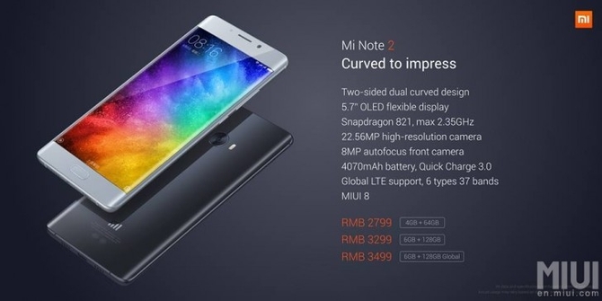 Xiaomi Mi Note 2 will go on sale on November 1st. younger version cost with 4 GB of RAM and 64 GB of internal memory will be 2799 yuan , and older with 6 GB of RAM and storage 128 GB - 3299 yuan . "Global" version with support for 4G + and LTE bandsworld will cost 3499 yuan . Buyers can choose between two colors: black (Piano Black) or silver (Glacier Silver).