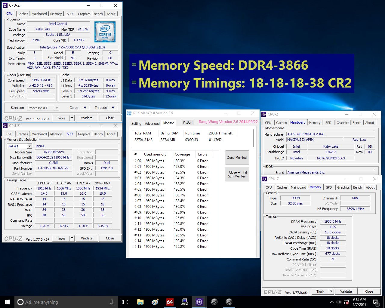 In addition to the sets for the Intel X99 platform, G.Skill also presented a Trident Z RGB DDR4 set of two 16GB modules each aimed at use with the Intel Z270 platform. This 32 GByte set operates at a frequency of 3866 MHz and the latencies are only CL18-18-18-38, which is also confirmed by the screenshot below. These modules also work with a voltage of 1.35 V, and support Intel XMP 2.0.