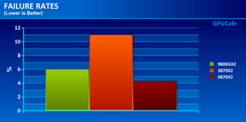 Two-Gpu video cards break more frequently than their single-chip analogs. Six percent Of GeForce 9800 GX2 was returned in connection with failure. The first two-chip AMD Radeon HD 3870 X2 fails in 11% of cases; however, the Radeon HD 4870 X2 was better with only 4.3% failures.